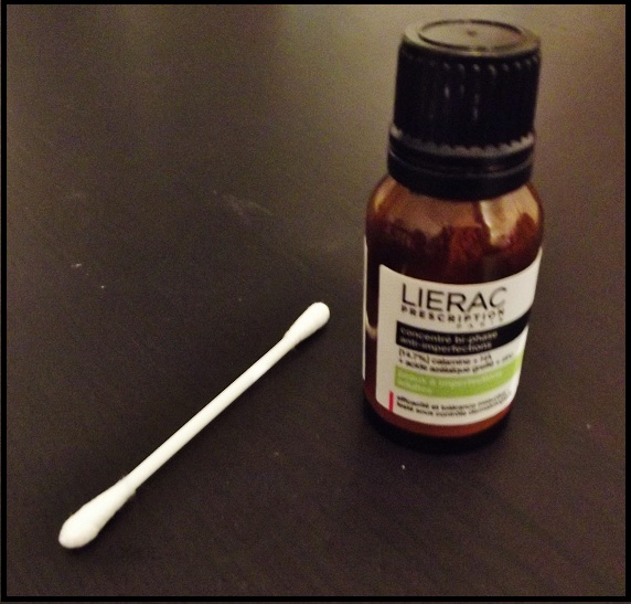 2 solutions dans le flacon (d’où le terme bi-phasé wouhhouuuuu) : une poudre et de l’alcool. On évite de secouer pour mélanger c’est pas du sirop, il vaut mieux que la poudre reste au fond. Tu prends ton coton-tige et tu le plonges jusqu’au fond (ça va, c’est pas un puit non plus, arrête d’en faire des caisses) pour aller chercher ladite poudrasse. Tu l’appliques ensuite sur le bouton à traiter (tu peux utiliser un coton normal si tu t’en ramasses 14 sur 2cm²).