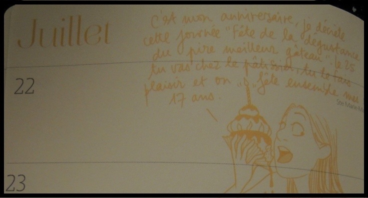 Le 23 juillet “C’est mon anniversaire, je décrète cette journée Fête de la dégustance du pire meilleur gâteau. Le 23, tu vas chez le patissier, tu te fais plaisir et on fête ensemble mes 17ans” Putaiiin Margaux a même deviné la date de mon anniv !! (bon ok, en fait le vrai chiffre c’est le 25, date du sien, d’anniv. Mais bon, c’est sur la même page, alors ça compte pareil. Pi tfaçon elle a même pas 17ans pour de vrai, elle non plus)
