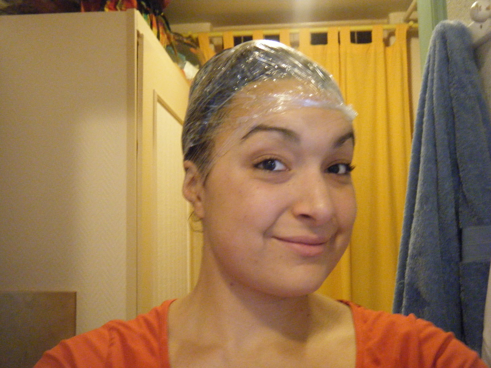 Enveloppez vos cheveux dans du film plastique ou si vous avez une charlotte, ce sera plus simple, et vous aurez moins l’air d’avoir un bonnet de bain transparent sur la tête!!! Quoique question “air stupide” je ne suis pas sûre qu’il y ait une solution plus jolie au final, entre l’une et l’autre!!!