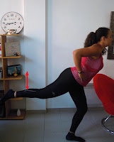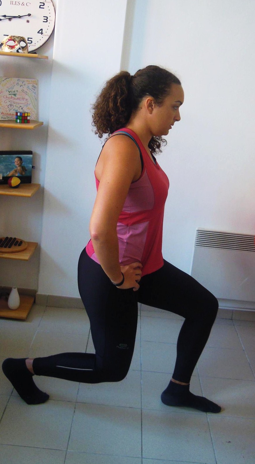 5) Les fessiers : une jambe est souple, et l’autre tendue vers l’arrière (le plus verticalement possible). Il faut faire des petits mouvements de haut en bas, le plus haut possible, et sans redescendre trop bas (c’est vers le haut que ça travaille).