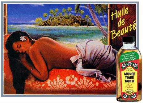 Le Monoï que l’on peut considérer comme un produit de beauté, obtenu par macérations de fleurs de Tiaré tahiti dans de l’huile raffinée de coprah. Il est utilisé comme tout le monde le sait, comme huile bronzante et ne protège pas du tout des ultraviolets donc peaux sensibles : s’abstenir. Dans tous les cas il évite la déshydratation de la peau au soleil et il sert aussi comme huile de massage et il est aussi très efficace pour huiler les cheveux secs.