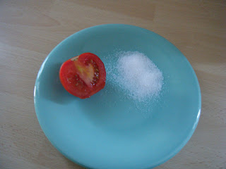 Coupez donc la tomate en deux et faites-la tremper dans le sucre.
