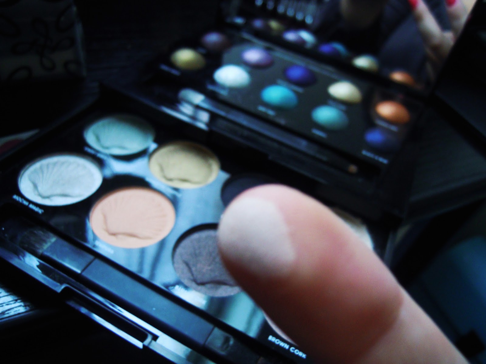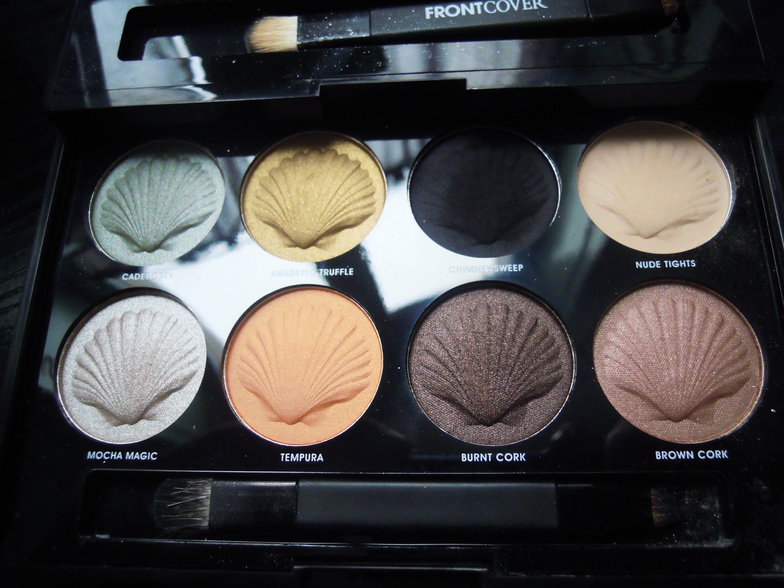 Du coup, pour 14 minuscules € (avec la remise, c’est pas foufou tout ça ??), tu rentres chez toi avec la palette Night Desk To Date de Front Cover : 18 fards – des clairs, des sombres, des neutres, des couleurs, des mats, des irisés, des paillettes, du métallique, franchement de quoi s’amuser ! T’as aussi un miroir géant et deux petits pinceaux très pratiques, un embout plat et un embout crayon à chaque fois (que j’utiliserai ici, et on parlera pinceaux un autre jour t’façon).