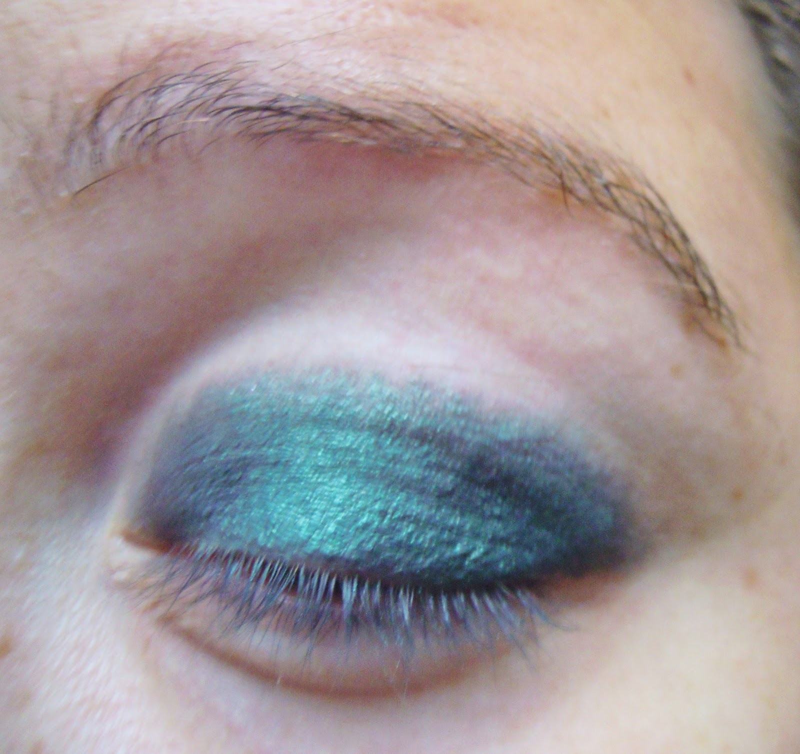 On prend l’autre pinceau plat (ou l’autre côté du même pinceau, OR-GA-NI-SA-TION) pour appliquer la couleur, sur le bombé de l’oeil (= on ne va pas jusqu’aux extrémités, ce qui n’est pas visible sur les photos, j’en conviens).
