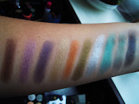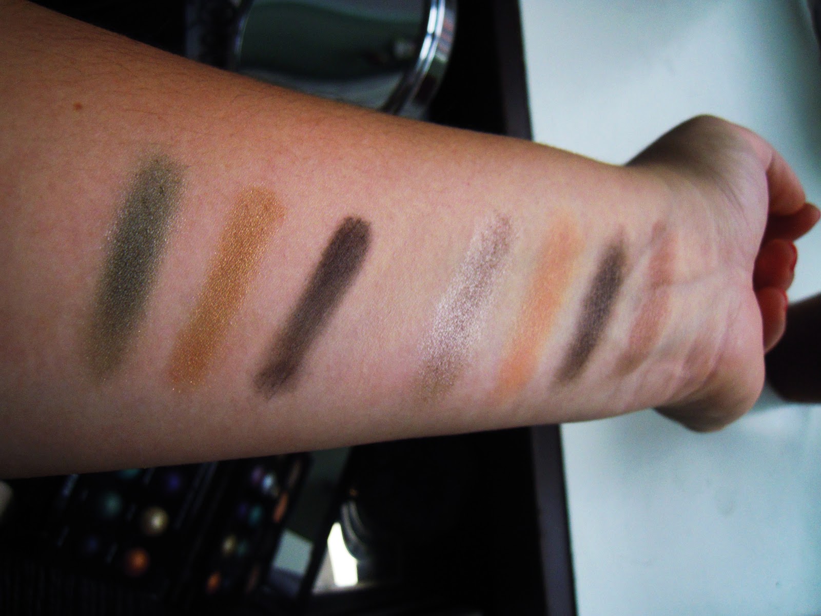 Voici les swatchs, dans l’ordre, pour vous donner une idée. En fait, je suis super contente d’avoir pour une fois une palette qui contient des couleurs VRAIMENT différentes. (Tu la connais la palette nude trop jolie mais dans laquelle t’as 3 beige clair, 4 marrons, 6 gris…)