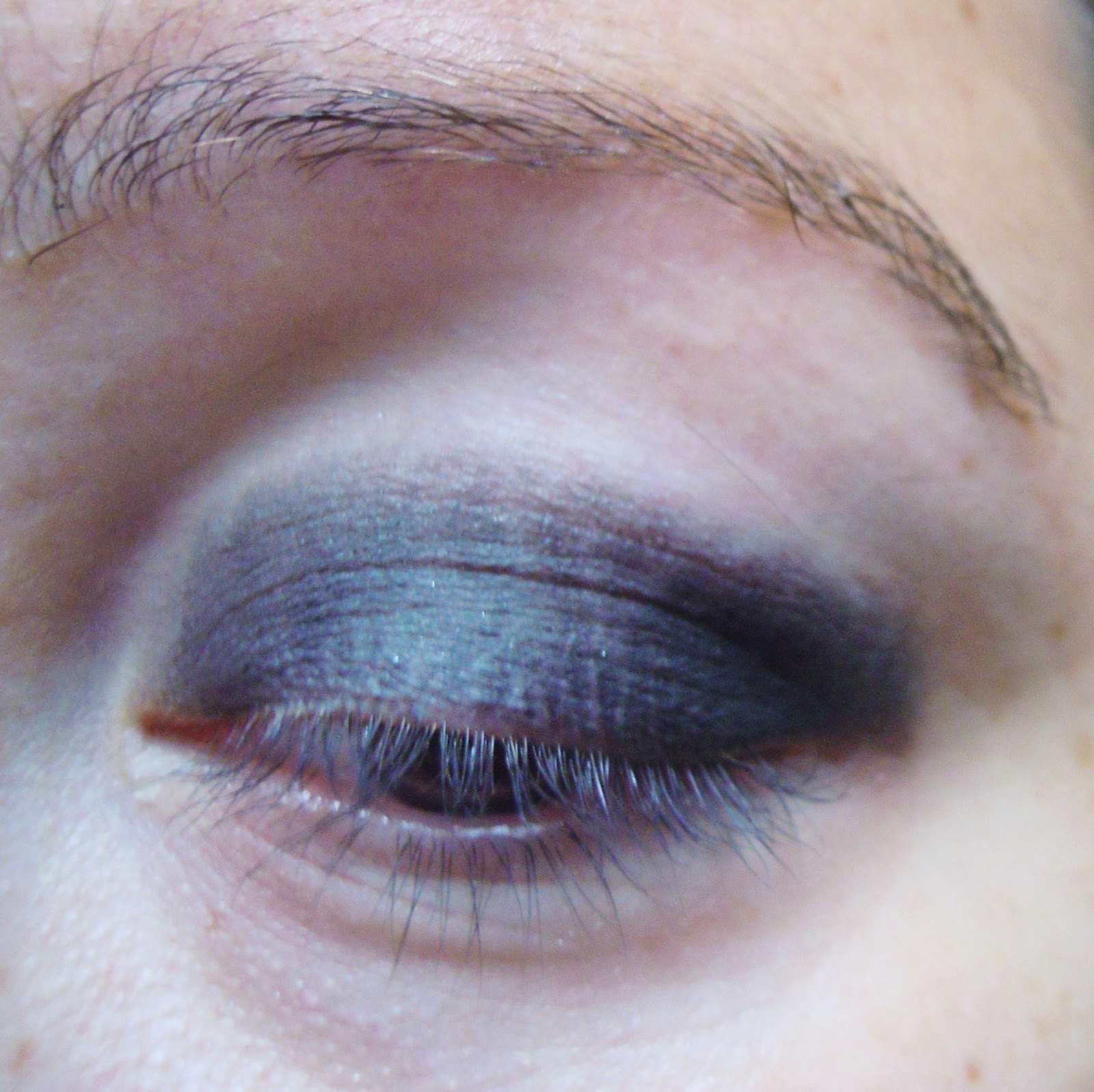 Grâce au pinceau à embout plat, on applique une couleur foncée et mate (ici le noir) en aplat sur toute la paupière mobile, en dégradé, le plus foncé dans le coin externe. On remonte bien au dessus de la paupière pour agrandiiiiiiiiiir le regard et créer une profondeur (pour vos soirées, vous pouvez remonter bien plus que moi, j’essaie d’éviter quand même le mode drag queen au boulot !).
